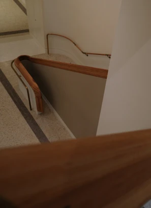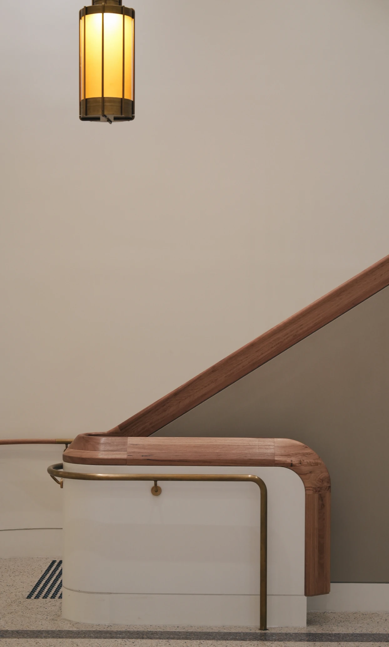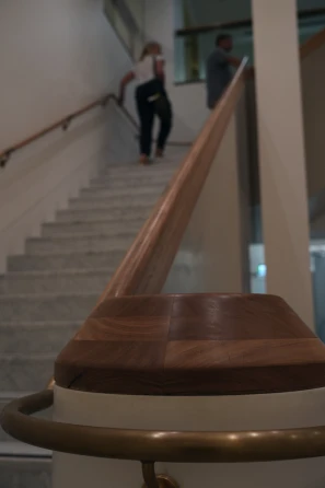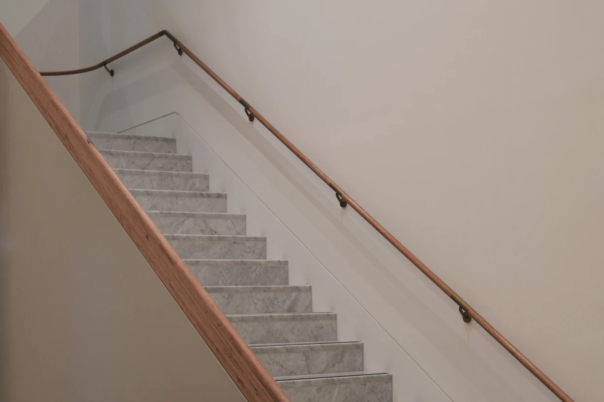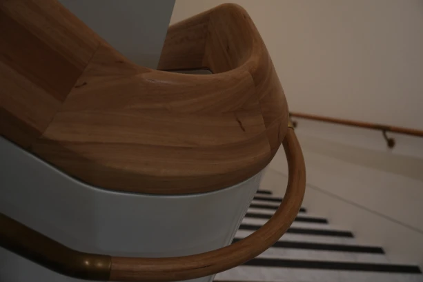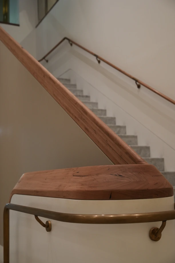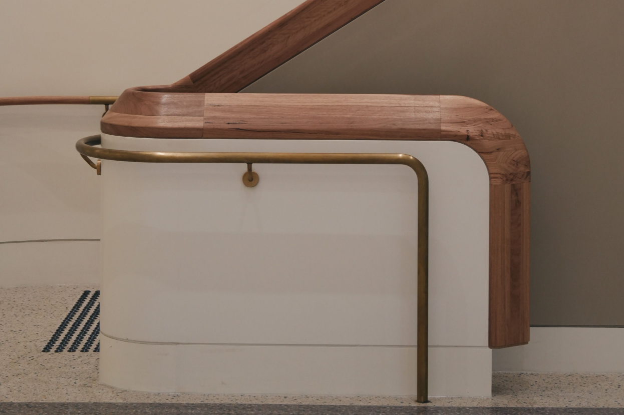 The project comprised two mirrored staircases with blackbutt balustrades and handrails that had to land perfectly flush with the corona wall below, following its radius corners and changing rakes. The design allowed no tolerance for deviation, which meant every component had to be measured, templated and installed to millimetre accuracy.