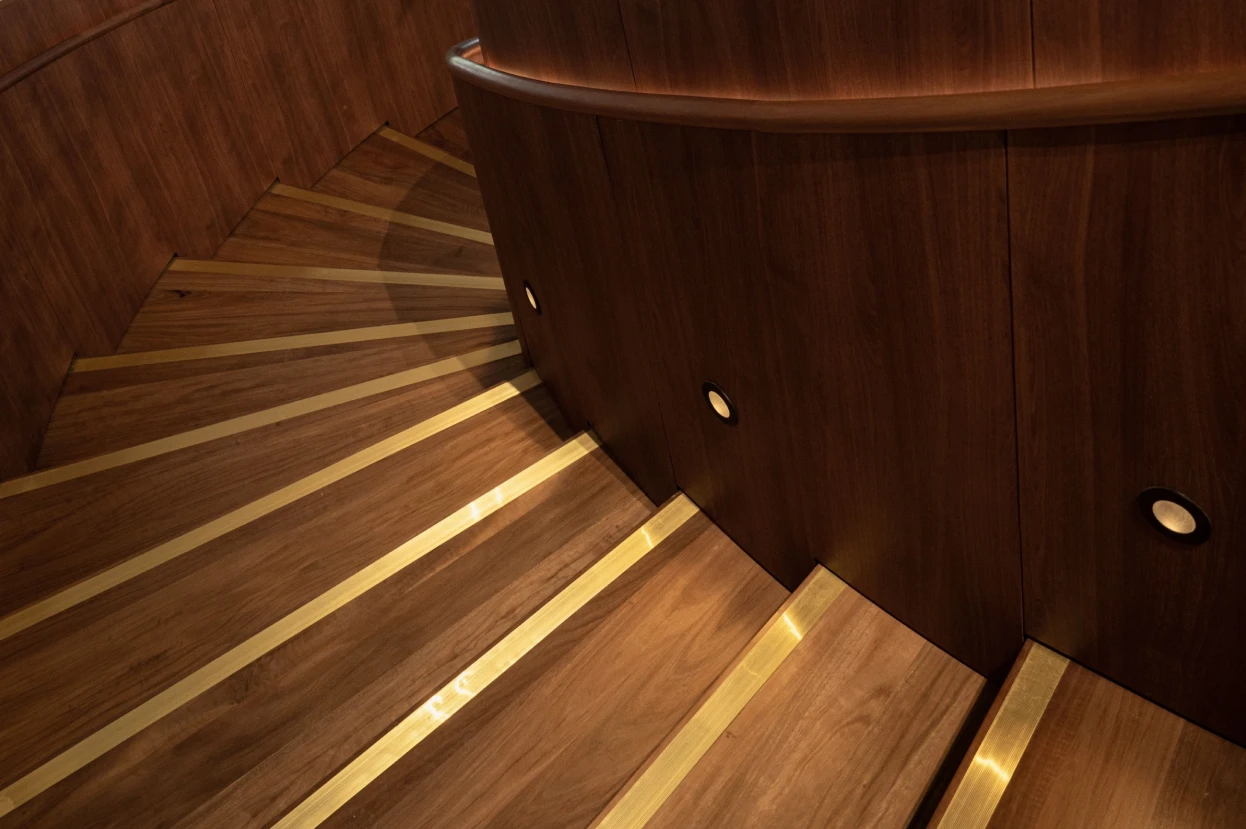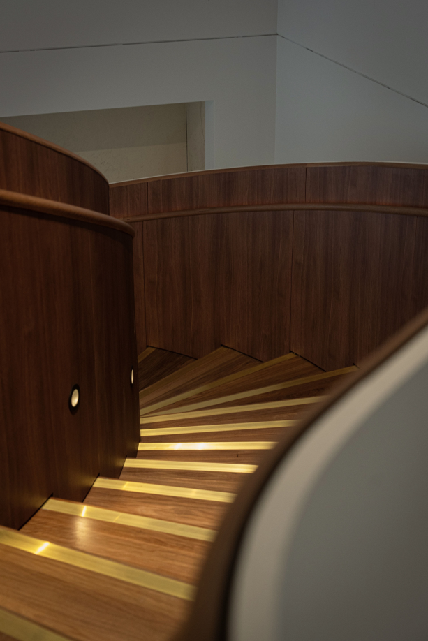 Across the entire project there are no visible fixings. Through concealed fixing methods and careful detailing, we avoided plugs, caps or stickers, so the stair reads as a continuous timber and veneer surface, uninterrupted by hardware.