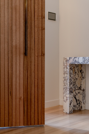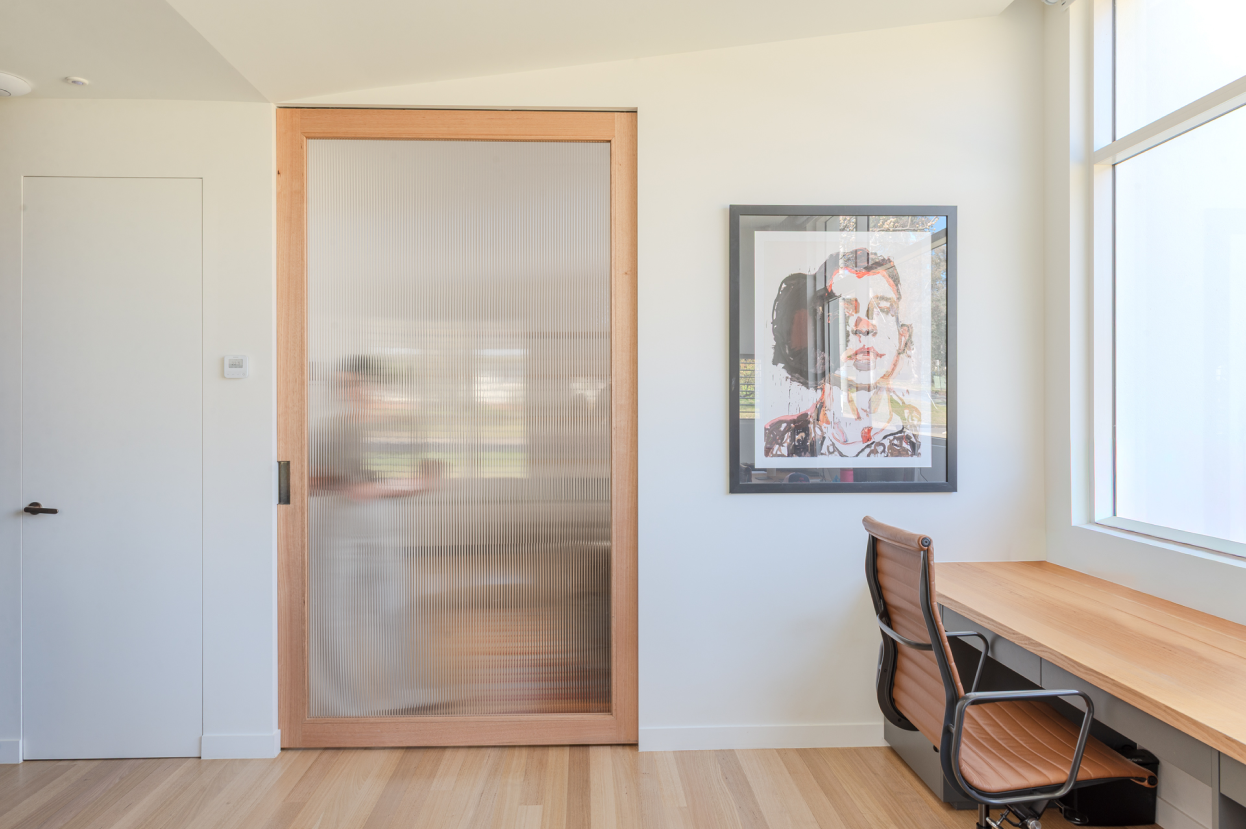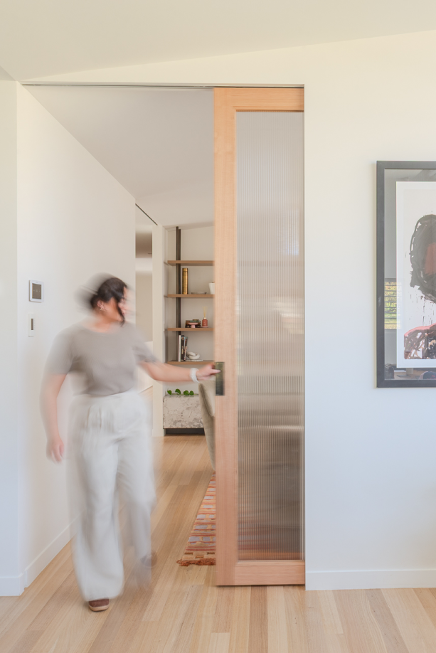The interior cavity slider is a fully set unit with no pelmets or architraves, measuring 1400 x 2700 mm. The mechanism is soft close and soft open, designed for ease of use and longevity. To maintain a slim wall profile without risk of movement, door stiles were re-sawn and face laminated. Materials include Victorian ash and fluted glass.