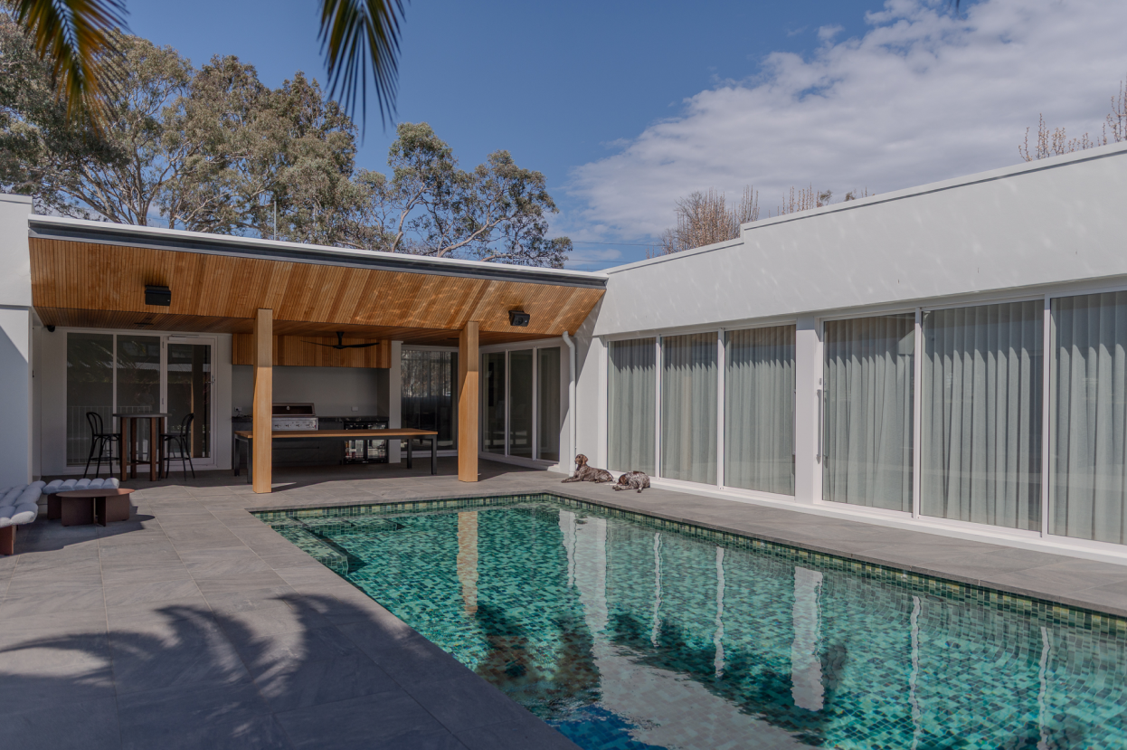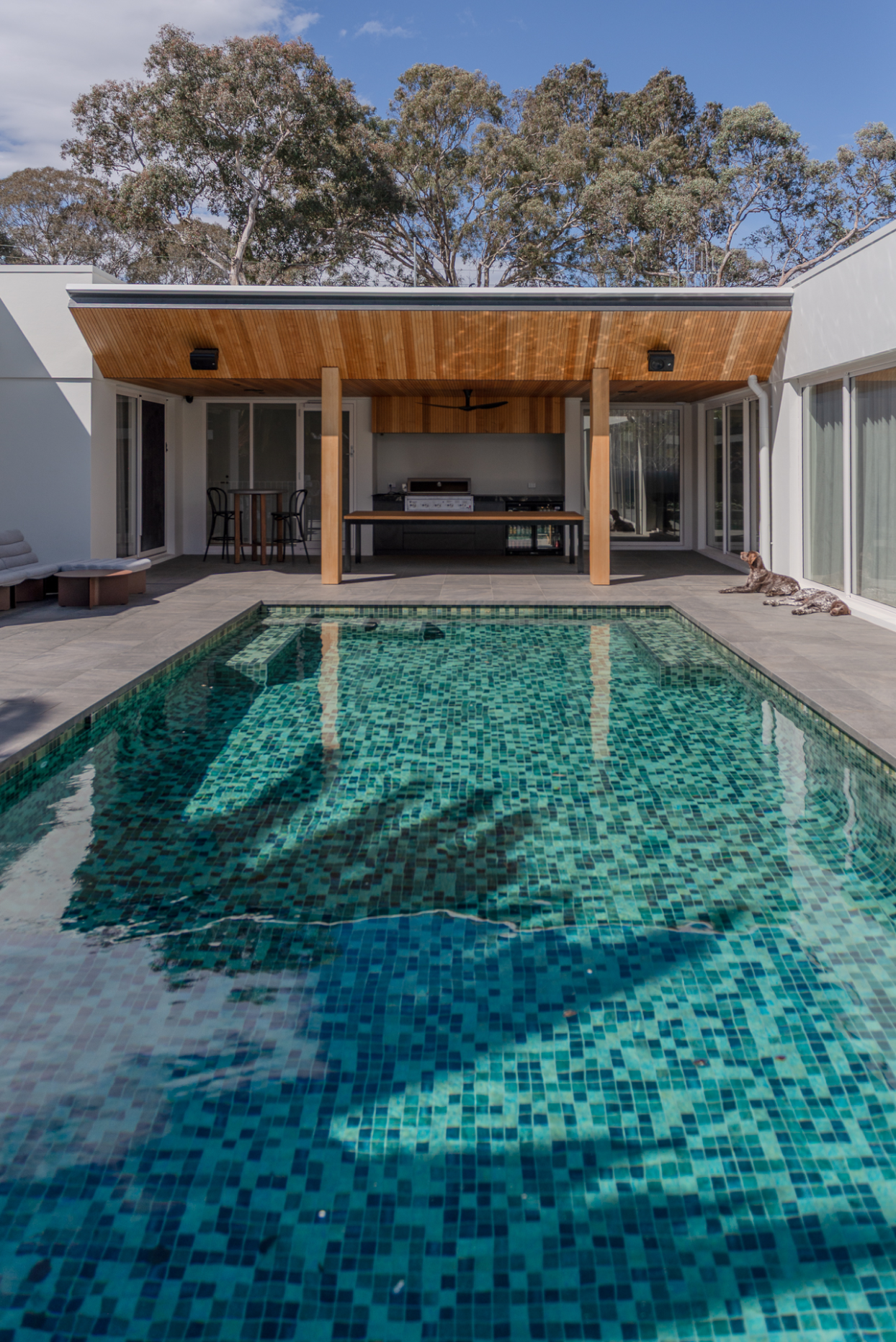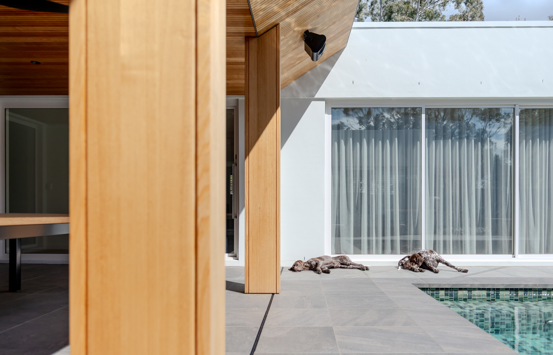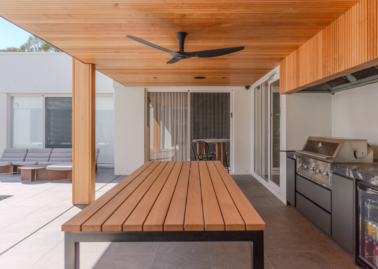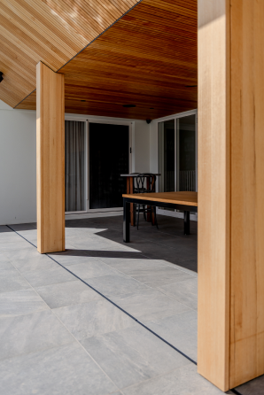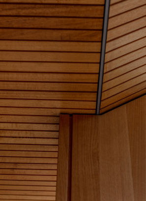 Existing structural steel beams in the outdoor area could not be removed, but lacked visual appeal. Our approach was to integrate them into the overall cladding language, wrapping them in timber with a 10 mm shadow line at the ceiling that ties into the castellated profile. Using a Lamello and domino system, we were able to clad the posts without any visible fixings.
