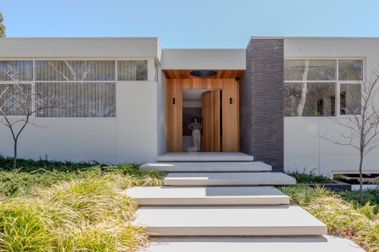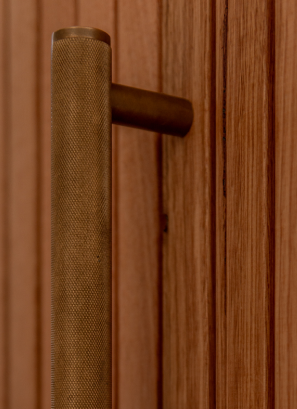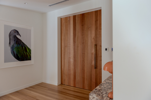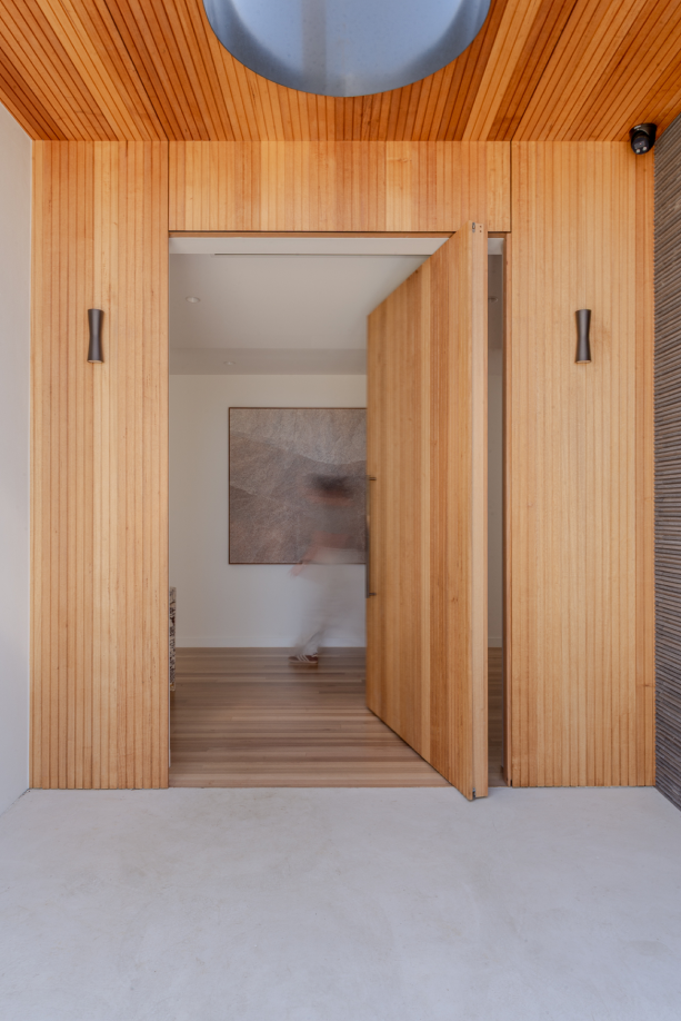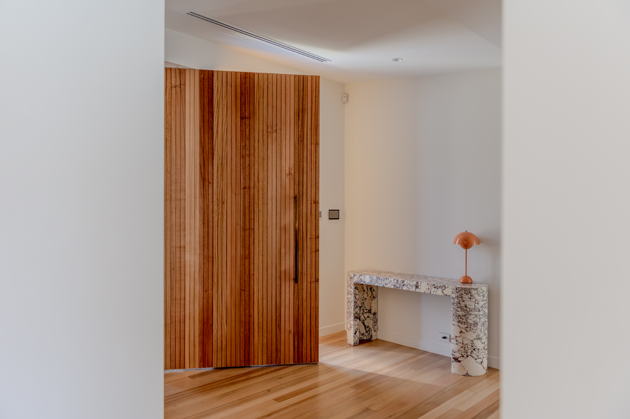 Internally, we worked closely with the plasterers to eliminate visible jambs, so the door reads as uninterrupted floor to ceiling castellated cladding when closed. Externally, we grain matched the head and ceiling cladding so the timber runs as a single, consistent surface across the entry.